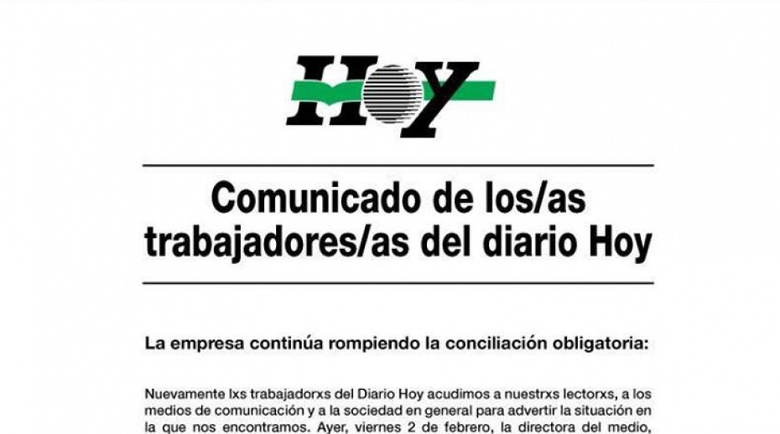A través de un comunicado publicado en un grupo de Facebook, los trabajadores del Diario Hoy denunciaron que la empresa Edigráfica, dueña del medio, nunca acató de forma completa la conciliación obligatoria, y que hoy la terminó de romper. En primer lugar, acusan a la directora del diario de no restituir las herramientas de trabajo del área audiovisual, y que tampoco funcionó la movilidad, indispensable para la tarea de periodistas y fotógrafos.