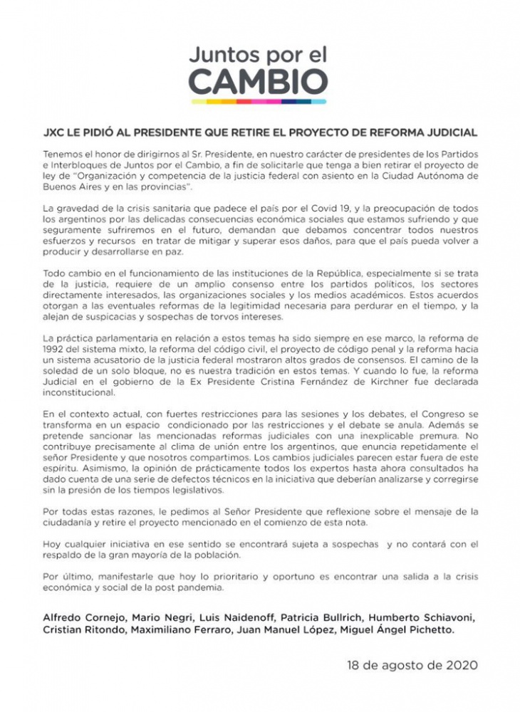En este contexto, el día de ayer Juntos por el Cambio envió una carta al presidente de la Nación, Alberto Fernández, pidiéndole que retire el proyecto de Ley. Argumentaron que la prioridad debe ser el abordaje del impacto socioeconómico de la pandemia, y que las restricciones no permiten el debate pertinente.