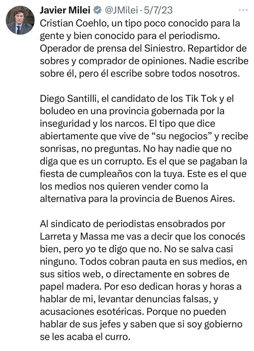 "Santilli estuvo con Menem, con Duhalde , con Ruckauf, con Macri y Larreta. Completito el colorado... Hace 30 años que vive de tu laburo y nuestros impuestos", manifestaba el economista liberal, que luego accedería a su banca de diputado nacional, que culmina en diciembre y no podrá renovar debido al escándalo que lo ubica financiado por dinero proveniente del narcotráfico.